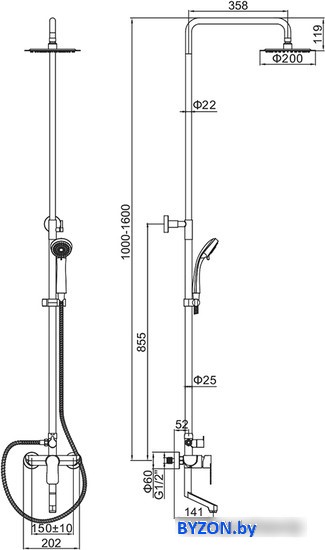 | Комплектация | верхний душ, штанга, ручной душ (лейка), держатель лейки, шланг, смеситель, излив для ванны |