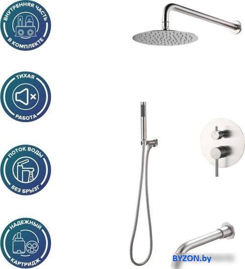 | Комплектация | верхний душ, ручной душ (лейка), держатель лейки, шланг, смеситель, излив для ванны |