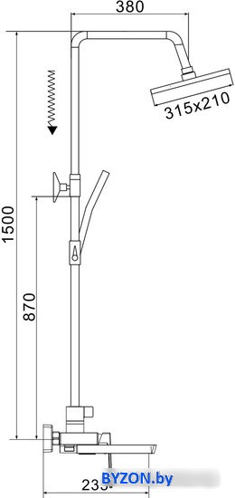 | Комплектация | верхний душ, штанга, ручной душ (лейка), держатель лейки, шланг, смеситель, излив для ванны |