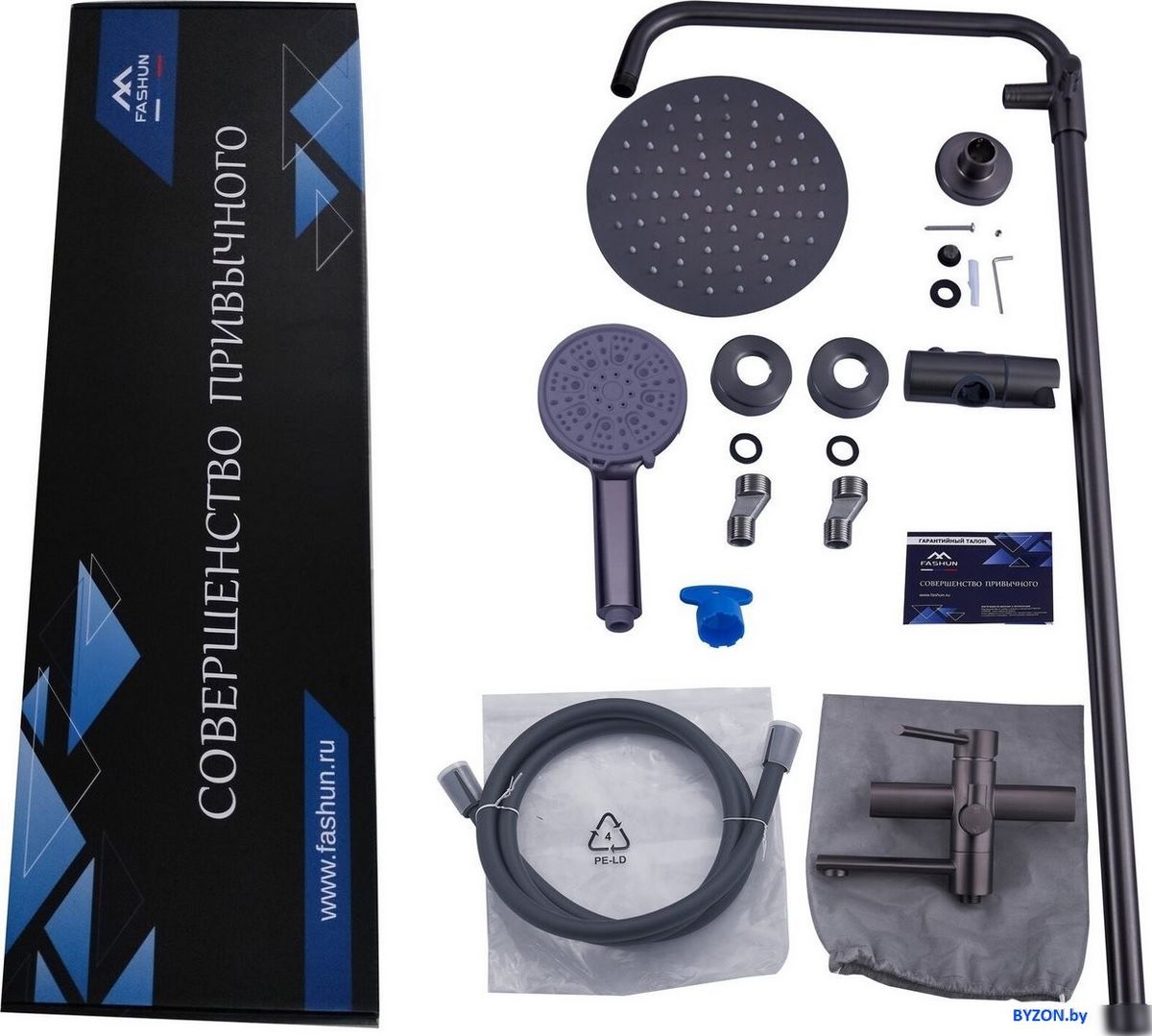 | Комплектация | верхний душ, штанга, ручной душ (лейка), держатель лейки, шланг, смеситель |