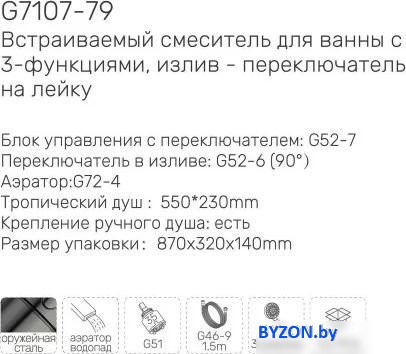 | Комплектация | верхний душ, штанга, ручной душ (лейка), держатель лейки, шланг, смеситель |