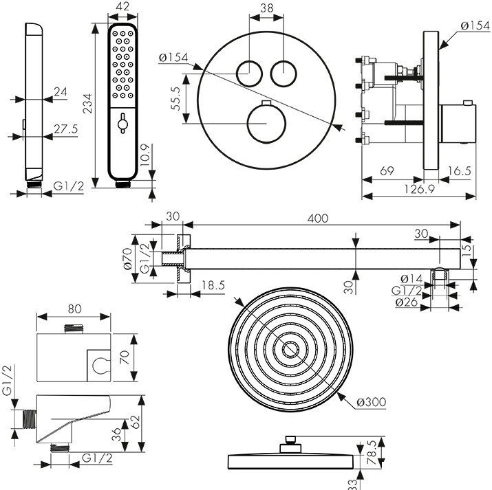 Код товара: 4949758 Рейтинг: 576 5| -844,42 душевая система (с верхним душем), скрытый монтаж, термостатический смеситель, верхний душ 300 мм, ручной душ 42 мм