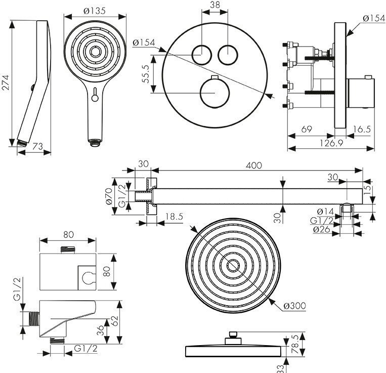 Код товара: 4949704 Рейтинг: 494 5| -723,28 душевая система (с верхним душем), скрытый монтаж, термостатический смеситель, верхний душ 300 мм, ручной душ 135 мм