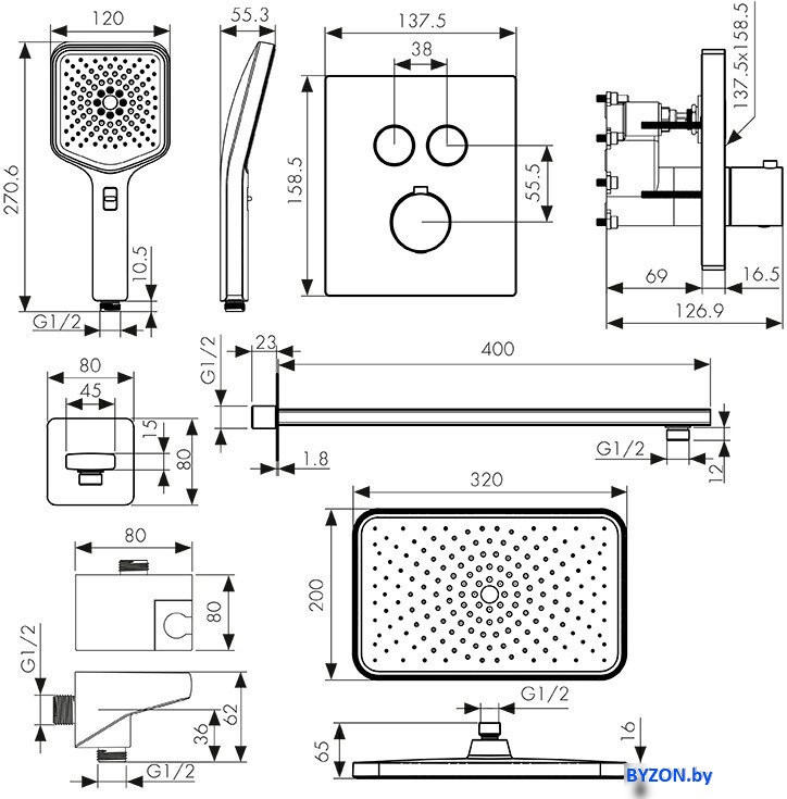 Код товара: 4949755 Рейтинг: 543 5| -765,73 душевая система (с верхним душем), скрытый монтаж, термостатический смеситель, верхний душ 320 мм, ручной душ 120 мм