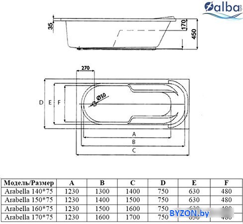 Ванна Alba Spa Arabella 140x75 (с ножками) - купить в Минске