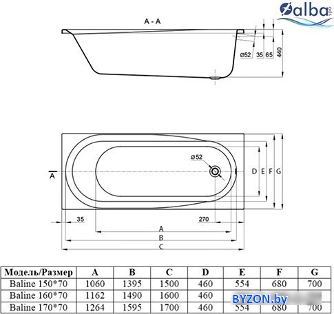 Ванна Alba Spa Baline 150x70 (с ножками) - купить в Минске