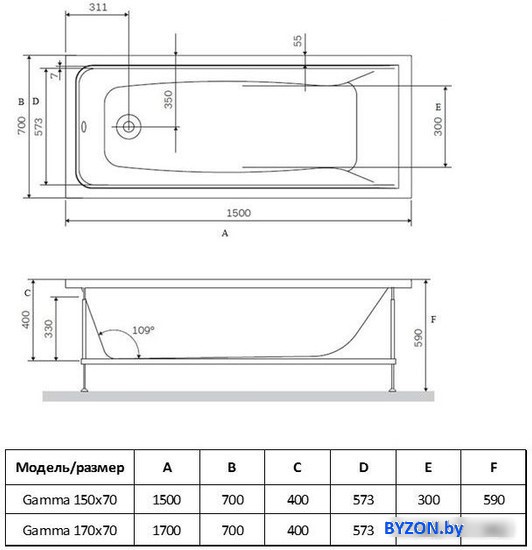 Ванна Alba Spa Gamma 170x70 (с ножками) - купить в Минске