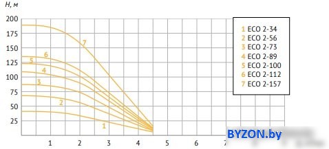 Информация | Погружные скважинные насосы UNIPUMP серии ЕСО — предназначены для бытового использования и применяются для подачи чистой воды из скважин диаметром не менее 110 мм, глубоких колодцев и открытых водоемов. Также они могут быть использованы для создания систем автоматического водоснабжения частных домов, дач и т.п. Насосы серии ЕСО не имеют аналогов. Корпус насоса выполнен из нержавеющей стали. Электродвигатель — однофазный. Проточная часть центробежного типа, рабочие колеса — «плавающие», выполнены из высокопрочного, износоустойчивого поликарбоната. «Плавающие» рабочие колеса обеспечивают продолжительный срок службы насосной части и уменьшают вероятность заклинивания при перекачивании воды с механическими примесями. Насос оснащен двухжильным электрокабелем. Пусковой конденсатор и тепловое реле встроены в корпус насоса, что существенно облегчает установку и эксплуатацию насоса. В перекачиваемой жидкости не должны содержаться длинноволокнистые включения. Расшифровка маркировки модели. Первая цифра обозначает номинальную производительность (м3/ч), вторые две цифры — номинальный напор (м). Например, насос ECO 2-34: 2 — номинальная производительность, м3/ч. 34 — номинальный напор, м. |