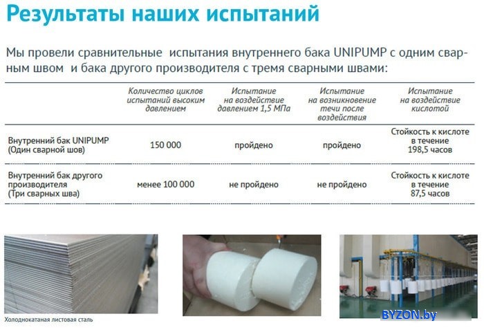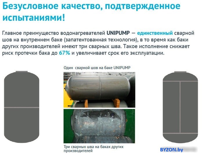| Информация | Водонагреватели UNIPUMP накопительные предназначены для нагрева воды, которая поступает из централизованных и автономных систем, имеющих водопровод холодной воды под давлением от 0,05 до 0,6 МПа. Водонагреватель способен обеспечивать одну или несколько точек потребления воды. Водонагреватель должен эксплуатироваться в закрытых отапливаемых помещениях. Водонагреватели накопительные являеются бытовыми приборами и не предназначены для коммерческого и промышленного использования. Эмалевое покрытие внутреннего бака BlueDiamond. Главное преимущество водонагревателей UNIPUMP — единственный сварной шов на внутреннем баке (запатентованная технология), в то время как баки других производителей имеют три сварных шва. Такое исполнение снижает риск протечки бака до 67% и увеличивает срок его эксплуатации. UNIPUMP применяет вихревую технологию подвода воды. Благодаря такой технологии сокращен риск смешивания горячей и холодной воды, тем самым увеличена эффективность водонагревателя. |